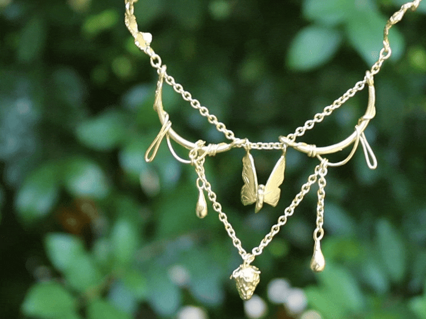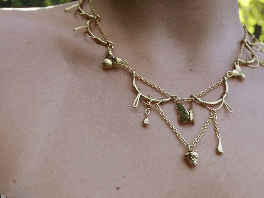Cada elemento fue modelado a mano en cera y luego fundido en metal, un proceso artesanal que permite crear formas complejas y llenas de carácter. Las pequeñas piezas cuelgan de delicadas cadenas generando movimiento constante y un juego de brillos cuando lo llevás puesto.