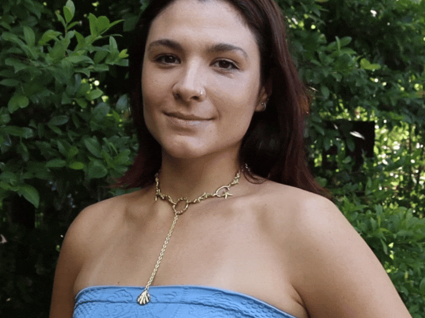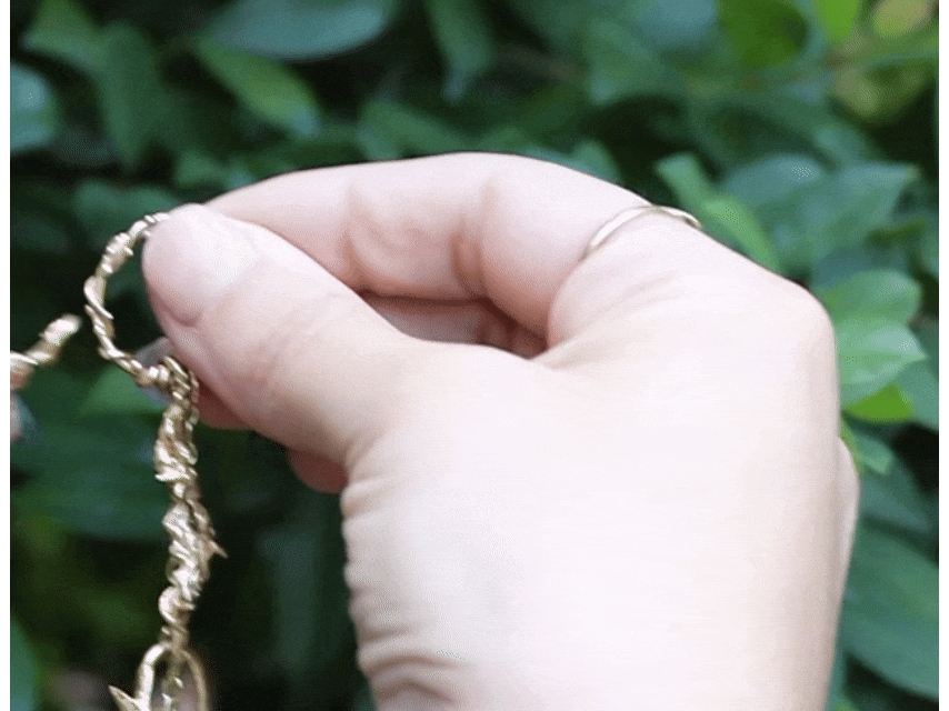 Este collar combina eslabones orgánicos inspirados en algas con pequeñas estrellas que aparecen entre ellas, generando una textura irregular y viva. El cierre se integra al diseño y queda oculto en el anillo central, del que cae una cadenita con un caracol colgante que completa la pieza. Mide 40 cm de largo: cercano al cuello, liviano y con mucho movimiento.