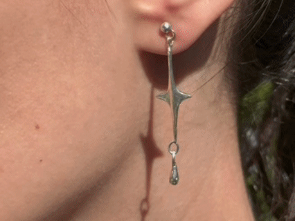 Los destellos combinan líneas marcadas y superficies pulidas con una gotita que cuelga en movimiento. Su cierre es tipo perno con traba mariposa. Miden 3 cm de largo: livianos, cómodos, icónicos. El Collar Reliquia tiene un cierre resorte; el típico de las cadenitas. Mide 5ocm cm de largo: liviano, cómodo, icónico.